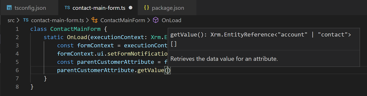 Now, what I love about XDT is the type inference, for example getting an attribute infers the type depending on the logical name and you get something a little like this when writing your code: